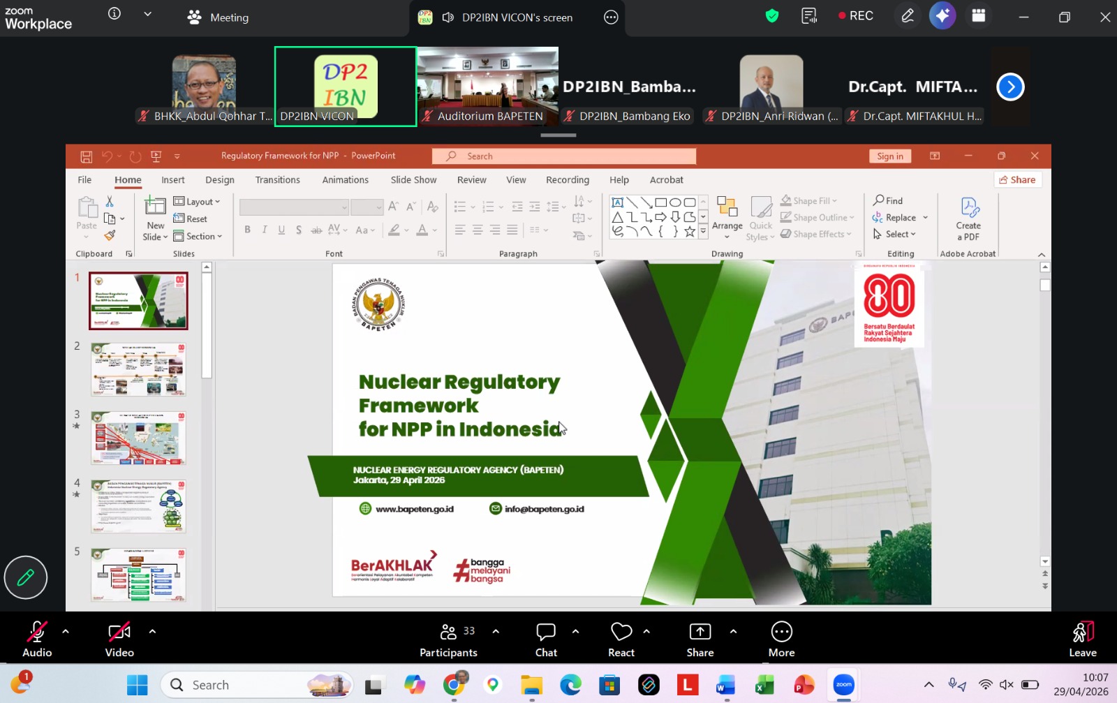 Kembali 29 April 2026 | Berita BAPETEN | 34 lihatDalam rangka meningkatkan kapasitas dan kapabilitas dalam pengawasan PLTN, khususnya PLTN terapung, BAPETEN bersama ROSATOM menyelenggarakan lokakarya kerangka regulasi PLTN terapung pada tanggal 29-30 April 2026. Kegiatan ini berlangsung secara hybrid di Auditorium BAPETEN dan Zoom Meeting. Selain itu, lokakarya ini juga bertujuan untuk membangun komunikasi yang efektif antara regulator di tingkat nasional (BAPETEN, KKP, KLH, dan Kemenhub) dengan vendor PLTN. Hal ini merupakan wujud komitmen bersama untuk memajukan program energi nuklir di Indonesia secara bertanggung jawab.