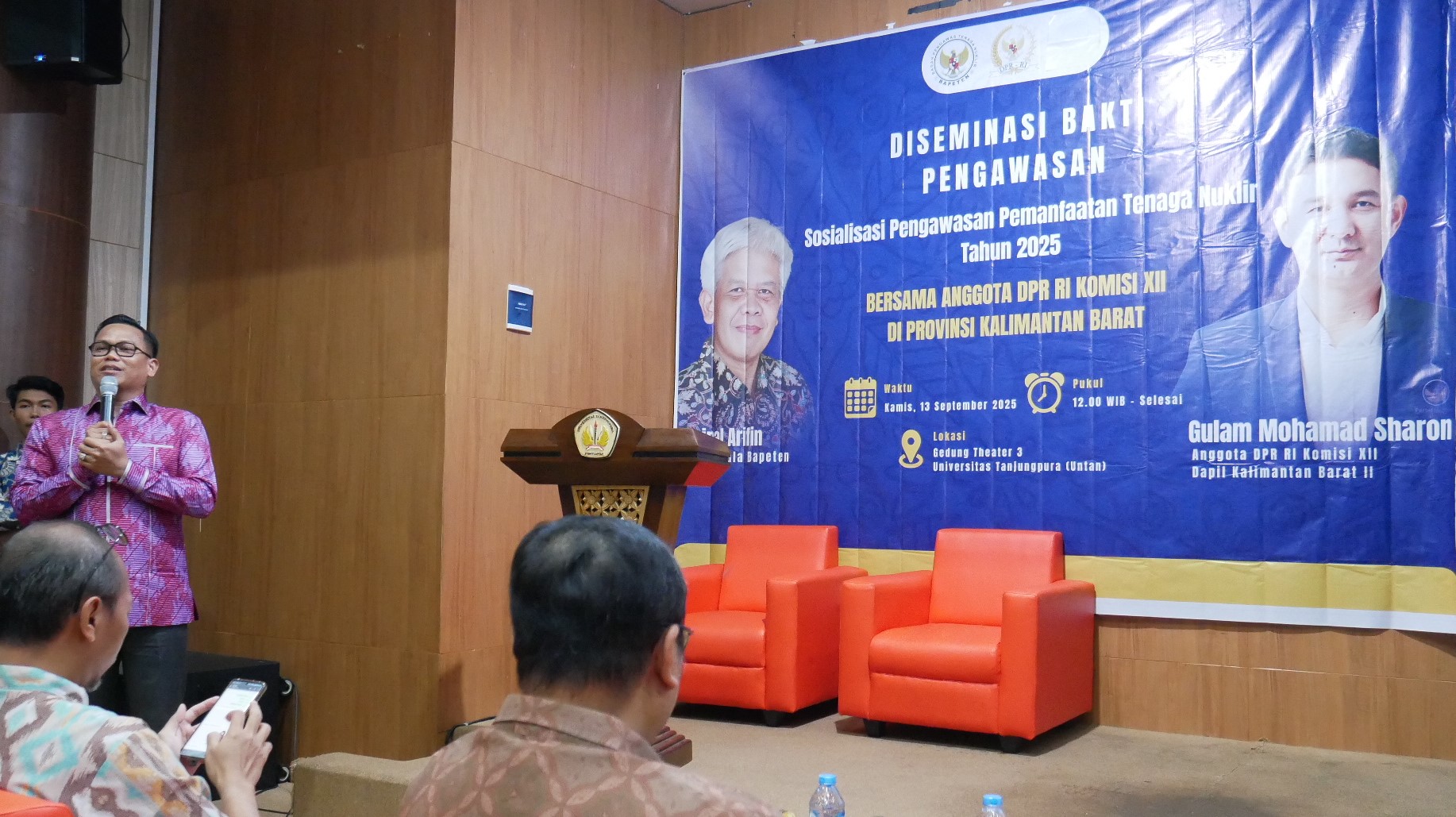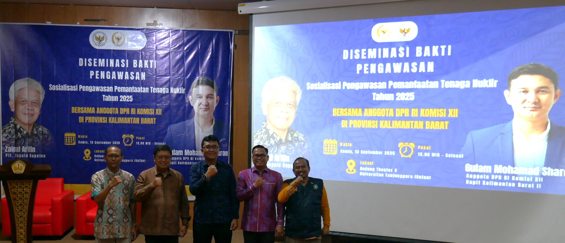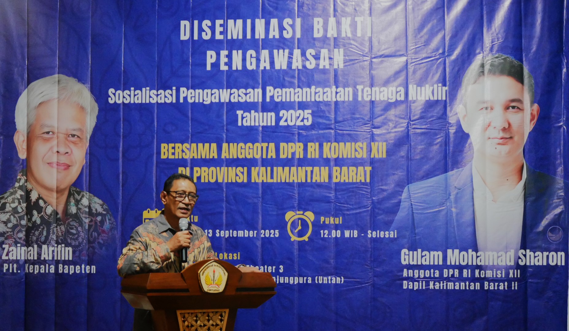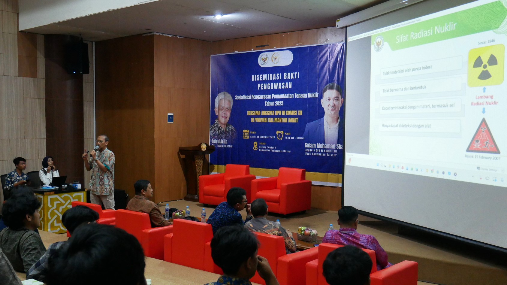 Kembali 13 November 2025 | Berita BAPETEN | 17 lihatBAPETEN bersama dengan anggota Komisi XII DPR RI, Gulam Mohamad Sharon melaksanakan Diseminasi Bakti Pengawasan Sosialisasi Pengawasan Pemanfaatan Tenaga Nuklir di Pontianak, Kalimantan Barat, 13 November 2025. Kegiatan yang dihadiri 151 mahasiswa dari berbagai perguruan tinggi di Kalimantan Barat ini, bertujuan untuk memberikan pemahaman yang tepat tentang tenaga nuklir serta pemanfaatan dan pengawasannya, sekaligus mengenalkan tugas dan fungsi BAPETEN sebagai lembaga pengawas pemanfaatan tenaga nuklir di Indonesia.