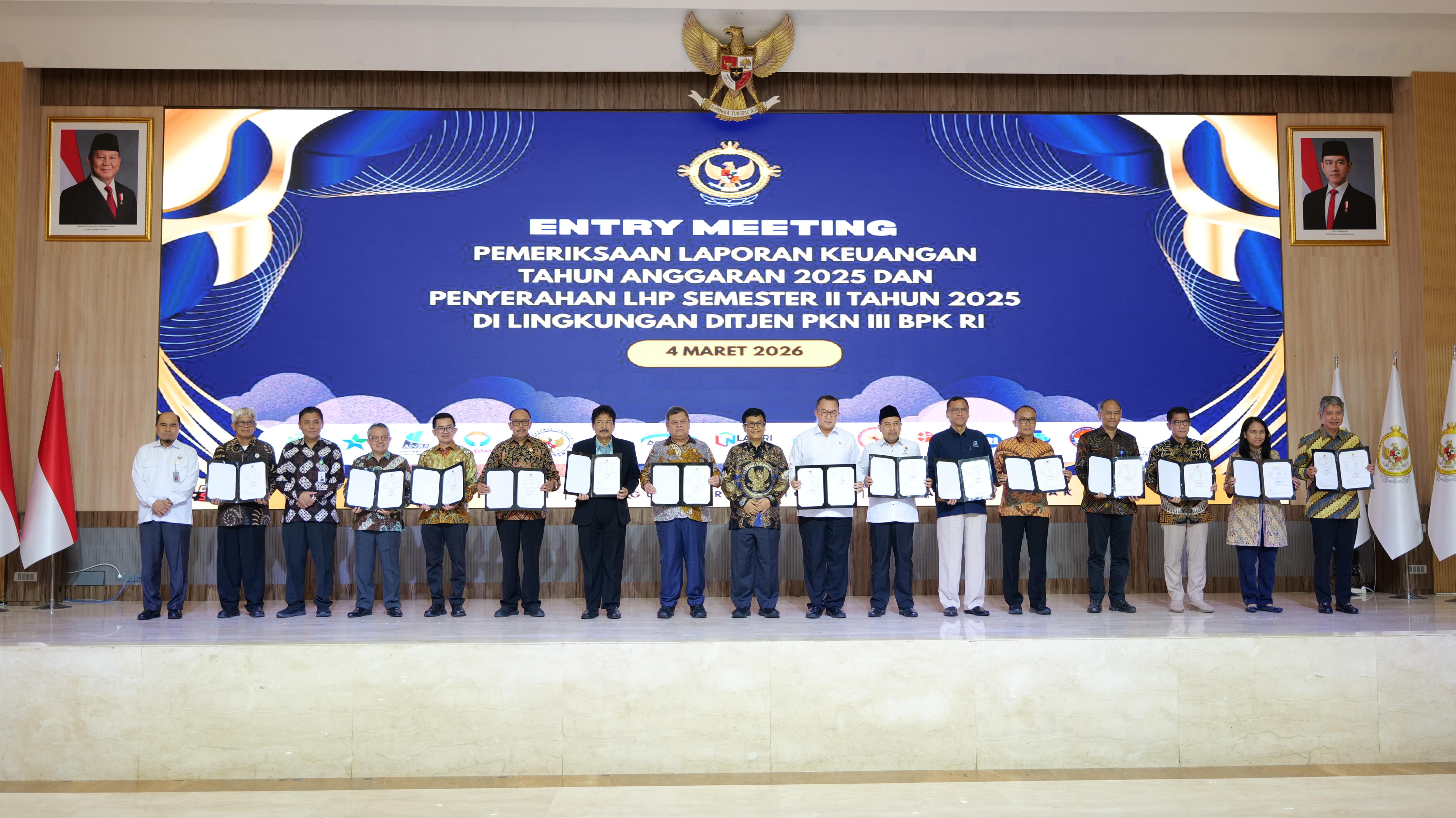 Kemudian, acara dilanjutkan dengan penyerahan Laporan Hasil Pemeriksaan (LHP) dan surat tugas pemeriksaan laporan keuangan badan/lembaga tahun 2025 oleh pimpinan PKN III kepada Plt. Kepala BAPETEN. Bersamaan dengan itu turut dilaksanakan sesi foto bersama sebagai penutup rangkaian acara.