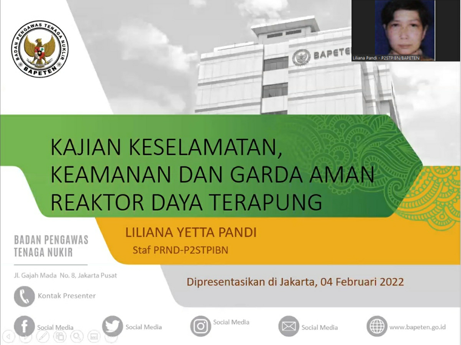 Hal tersebut diungkapkan dalam Diseminasi Hasil Kajian Instalasi dan Bahan Nuklir yang diselenggarakan secara daring oleh Pusat Pengkajian Sistem dan Teknologi Pengawasan Instalasi dan Bahan Nuklir (P2STPIBN) BAPETEN, Jumat (04/02). Kegiatan diseminasi ini menghadirkan pengawas radiasi utama di lingkungan BAPETEN sebagai narasumber, yaitu Liliana Yetta Pandi, Reno Alamsyah, dan Khoirul Huda.