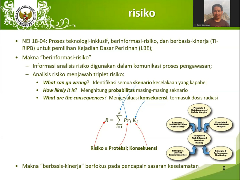 Selanjutnya, presentasi oleh Reno Alamsyah terkait Pendekatan Berperingkat (Graded Approach) Reakor Air Ringan (Light Water Reactor - LWR) pada Small Modular Reactor (SMR) yang berteknologi LWR dan Non-LWR. Reno menjelaskan bahwa dengan pendekatan berperingkat ini, maka persyaratan keselamatan maupun perizinan reaktor nuklir dapat disesuaikan dengan tingkat risikonya.
