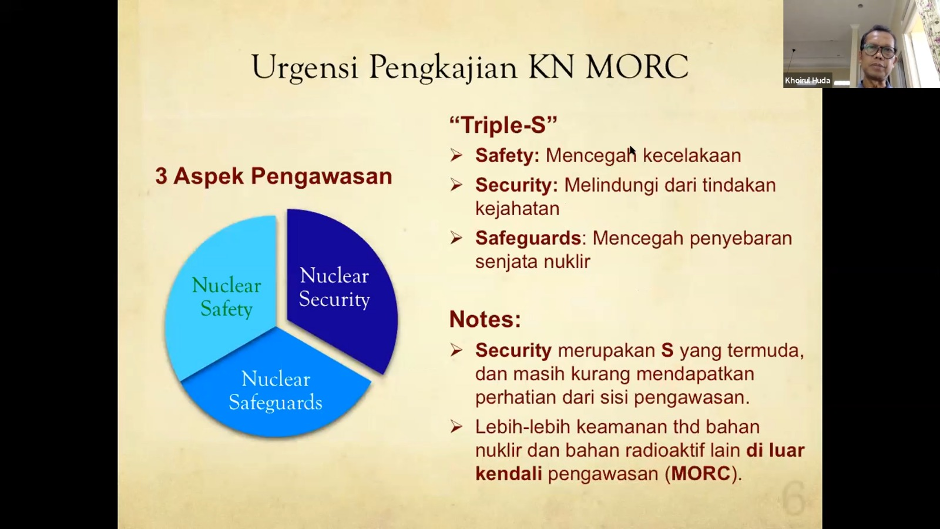 Presentasi terakhir dibawakan oleh Khoirul Huda terkait Diseminasi Kajian Keamanan Nuklir Terhadap Bahan Nuklir atau Bahan Radioaktif Lain di Luar Kendali Pengawasan (Materials Out of Regulatory Control/MORC). Khoirul menjelaskan bahwa bahan nuklir dan bahan radioaktif bisa keluar dari kendali pengawasan apabila bahan berbahaya tersebut berhasil lolos dari proteksi keamanan yang berlapis dan pengawasan yang ketat.