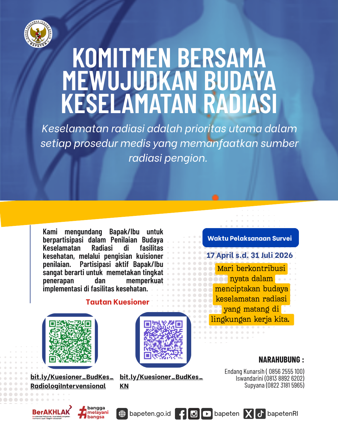 Kembali 27 April 2026 | Info BAPETEN | 22 lihatBAPETEN mengundang Bapak/Ibu untuk berpartisipasi dalam Penilaian Budaya Keselamatan Radiasi di Fasilitas Kesehatan. Partisipasi aktif Bapak/Ibu sangat berarti untuk memetakan tingkat penerapan dan memperkuat implementasi di fasilitas kesehatan. Mari berkontribusi nyata dalam menciptakan budaya keselamatan radiasi yang matang di lingkungan kerja kita. Untuk informasi lebih lanjut silakan menghubungi narahubung pada flyer di bawah ini: