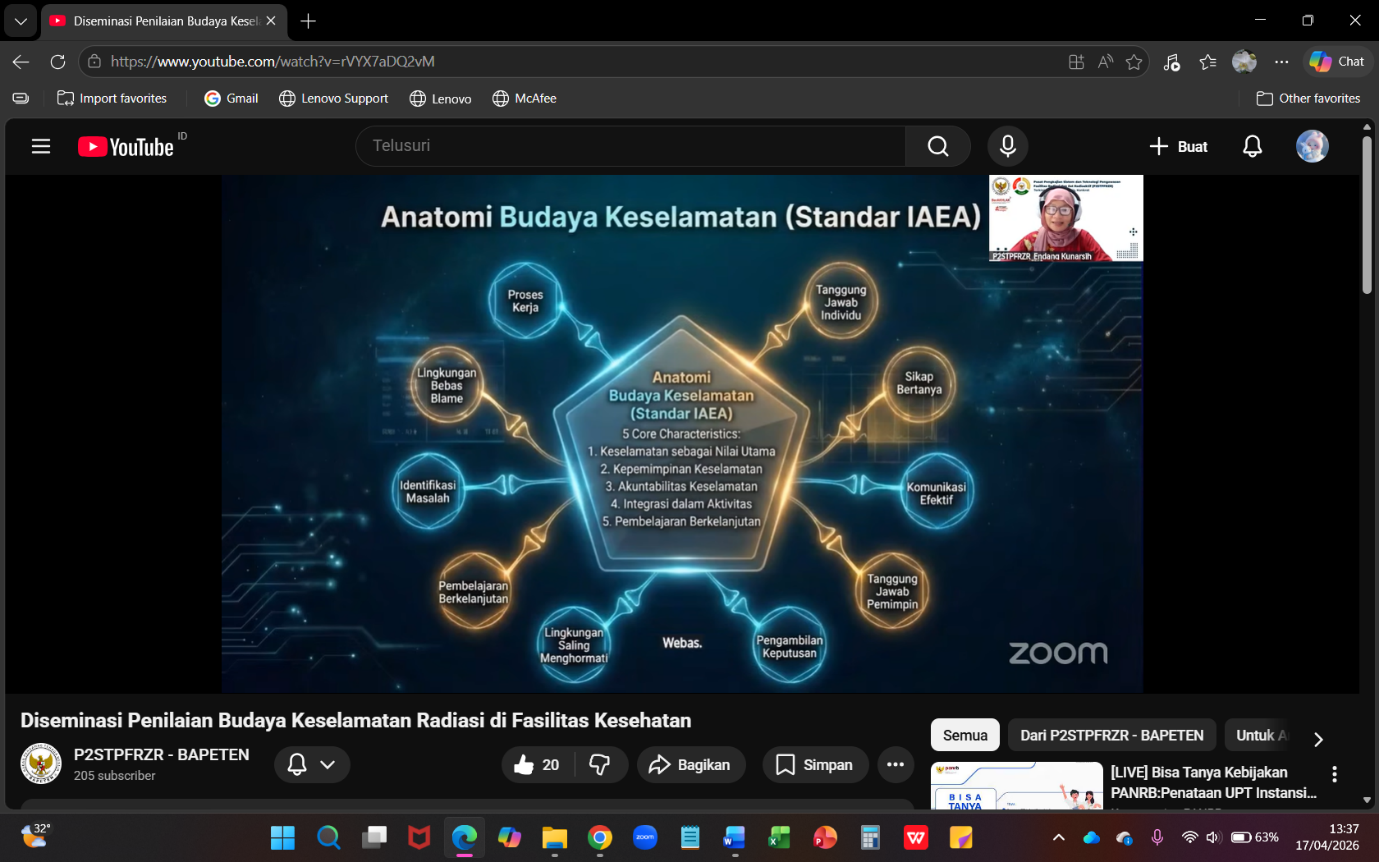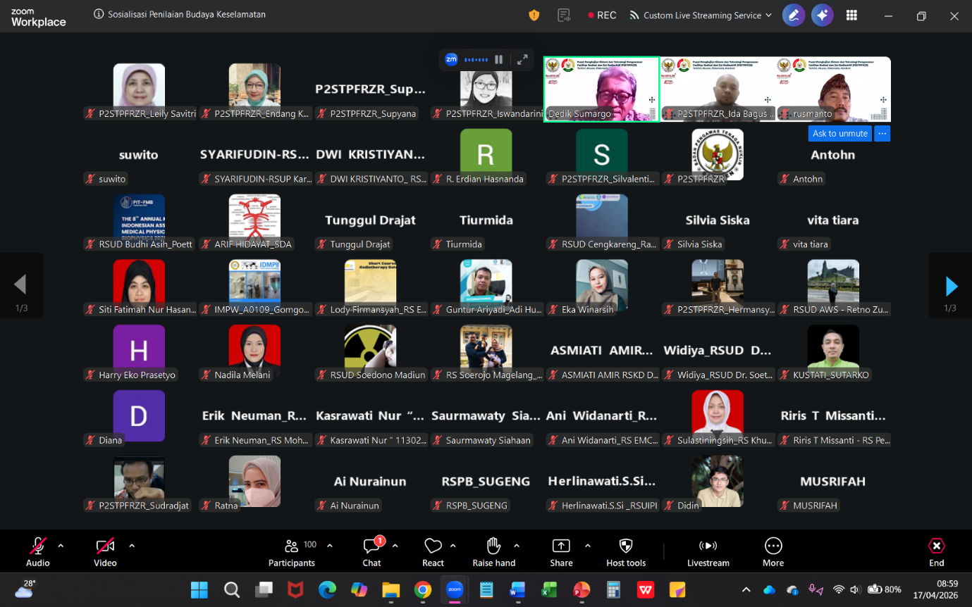 Kembali 17 April 2026 | Berita BAPETEN | 26 lihatBAPETEN melalui Pusat Pengkajian Sistem dan Teknologi Pengawasan Fasilitas Radiasi dan Zat Radioaktif (P2STPFRZR) menyelenggarakan diseminasi daring mengenai Penilaian Penerapan Budaya Keselamatan di Fasilitas Kesehatan pada 17 April 2026. Kegiatan ini merupakan langkah awal krusial sebelum dimulainya survei nasional bagi fasilitas kesehatan di seluruh Indonesia.