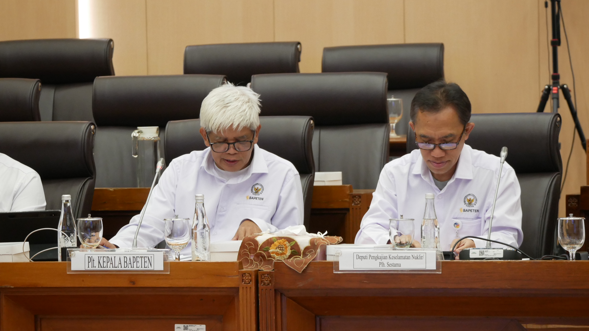 Dalam RDP kali ini, Plt. Kepala BAPETEN didampingi oleh Deputi Pengkajian Keselamatan Nuklir BAPETEN sekaligus Plh. Sekretaris Utama BAPETEN Haendra Subekti, Plt. Kepala Biro Perencanaan, Informasi, dan Keuangan (BPIK) Roy Candra Primarsa, Biro Hukum, Kerja Sama dan Komunikasi Publik (BHKK) Ishak, Kepala Biro Organisasi dan Umum (BOU) Indra Gunawan, Direktur Perizinan Instalasi dan Bahan Nuklir (DPIBN) Wiryono, Direktur Pengaturan Pengawasan Instalasi dan Bahan Nuklir (DP2IBN) Nur Syamsi Syam, Direktur Pengaturan Pengawasan Fasilitas Radiasi dan Zat Radioaktif (DP2FRZR) Mukhlisin, Direktur Inspeksi Instalasi dan Bahan Nuklir (DIIBN) Lukman Hakim, Direktur Inspeksi Fasilitas Radiasi dan Zat Radioaktif (DIFRZR) Zulkarnain, Direktur Keteknikan dan Kesiapsiagaan Nuklir (DKKN) Judi Pramono, Kepala Inspektorat Achmad Bussamah dan Kepala Balai Diklat Ahmad Ciptadi Syuryavin.
