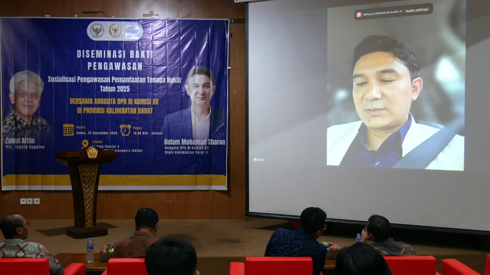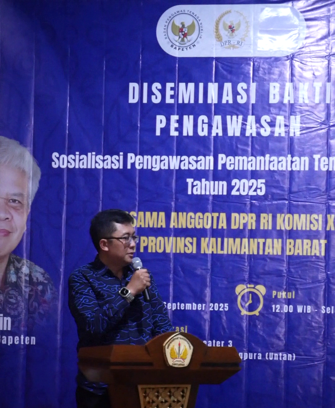 Kembali 13 November 2025 | Berita BAPETEN | 17 lihatBAPETEN bersama dengan anggota Komisi XII DPR RI, Gulam Mohamad Sharon melaksanakan Diseminasi Bakti Pengawasan Sosialisasi Pengawasan Pemanfaatan Tenaga Nuklir di Pontianak, Kalimantan Barat, 13 November 2025. Kegiatan yang dihadiri 151 mahasiswa dari berbagai perguruan tinggi di Kalimantan Barat ini, bertujuan untuk memberikan pemahaman yang tepat tentang tenaga nuklir serta pemanfaatan dan pengawasannya, sekaligus mengenalkan tugas dan fungsi BAPETEN sebagai lembaga pengawas pemanfaatan tenaga nuklir di Indonesia.