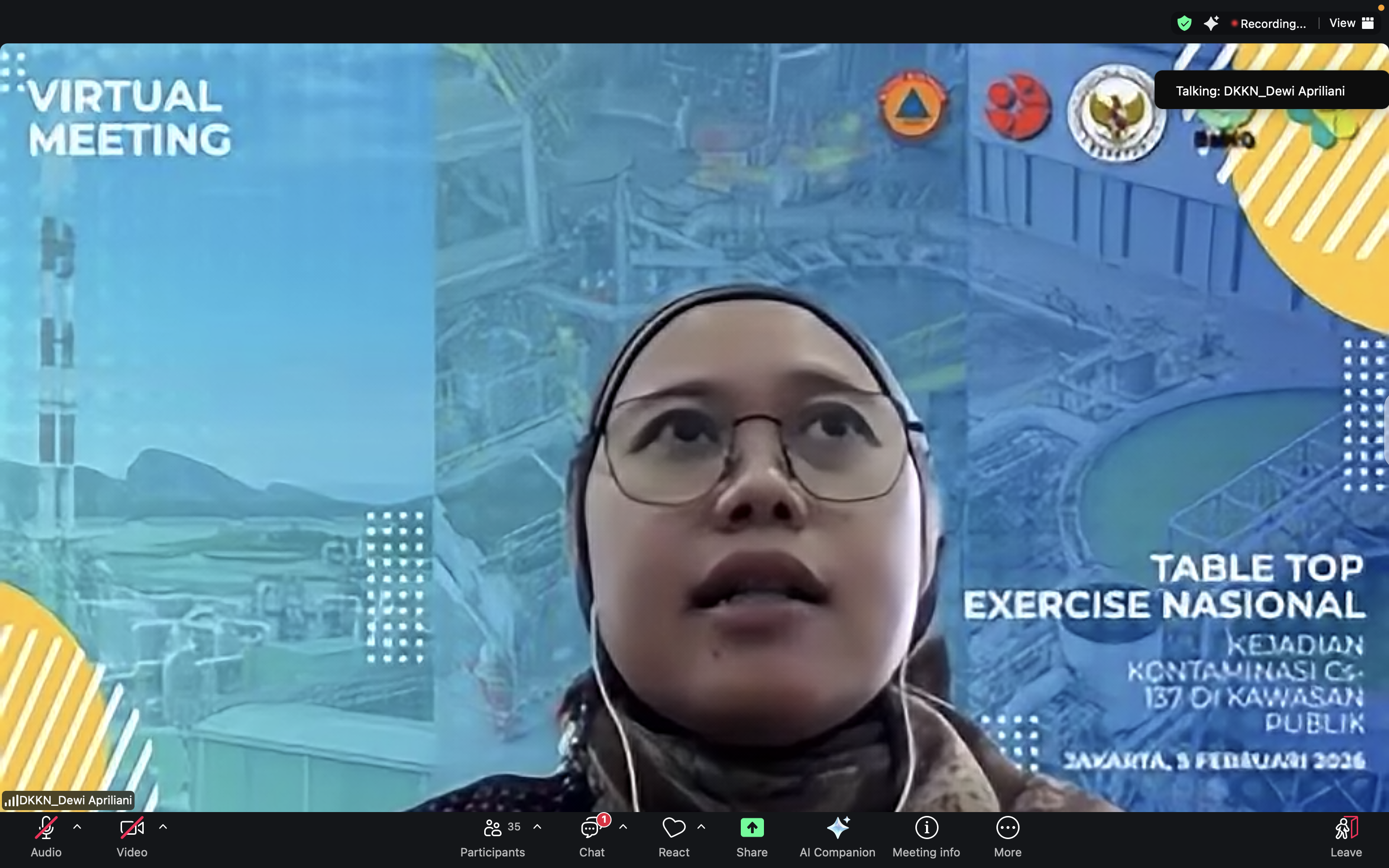 Kembali 05 Februari 2026 | Berita BAPETEN | 46 lihatBAPETEN menyelenggarakan Table Top Exercise (TTX) Kejadian Kontaminasi Cs-137 di Kawasan Publik pada 5 Februari 2026. Kegiatan yang diadakan secara hybrid ini diikuti 36 peserta dari internal BAPETEN, BRIN, BMKG, BNPB, dan Kementerian Kesehatan.