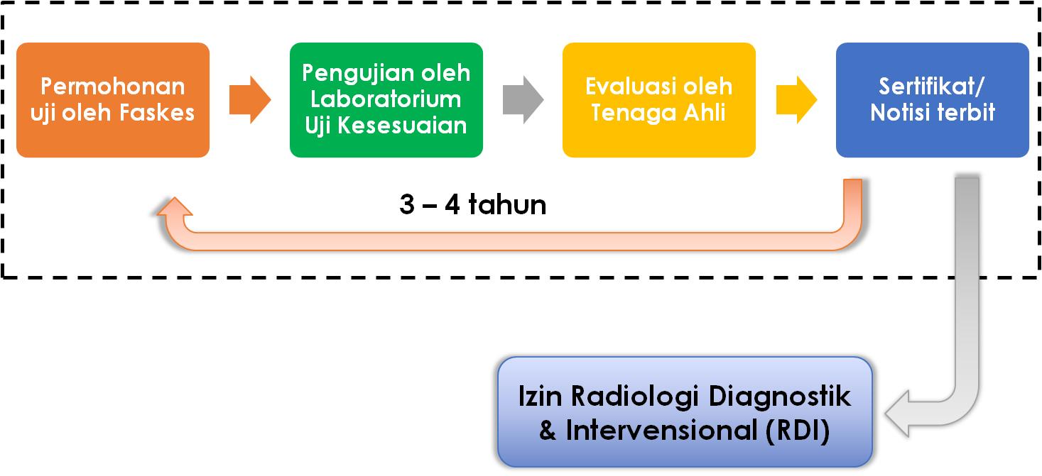 Setiap pesawat sinar-X radiologi diagnostik dan intervensional yang digunakan di fasiilitas kesehatan harus diuji sebelum dioperasikan dan diuji secara berkala. Pengujian yang dikenal sebagai uji kesesuaian tersebut diatur dalam Peraturan Kepala BAPETEN Nomor 9 Tahun 2011 tentang Uji Kesesuaian Pesawat Sinar-X Radiologi Diagnostik dan Intervensioal.