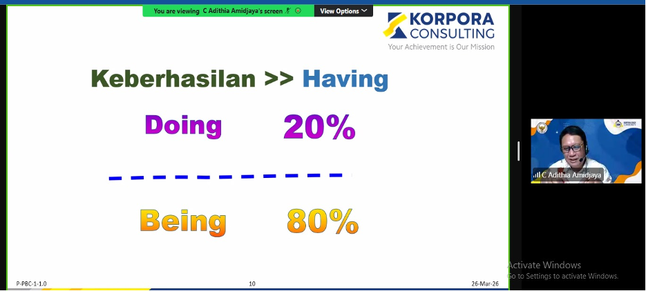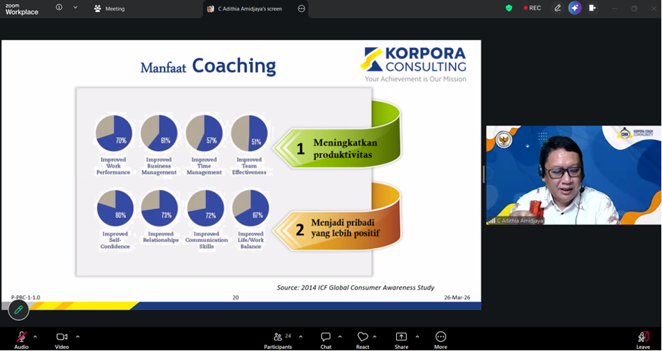 Dalam kegiatan ini, peserta memperoleh pemaparan mengenai konsep dasar coaching oleh narasumber dari Korpora Consulting, yang memberikan pemahaman mengenai manfaat coaching, perbedaan coaching dengan mentoring, consulting, training, dan consulting serta pentingnya membangun kesadaran diri dalam menemukan solusi atas permasalahan yang dihadapi.