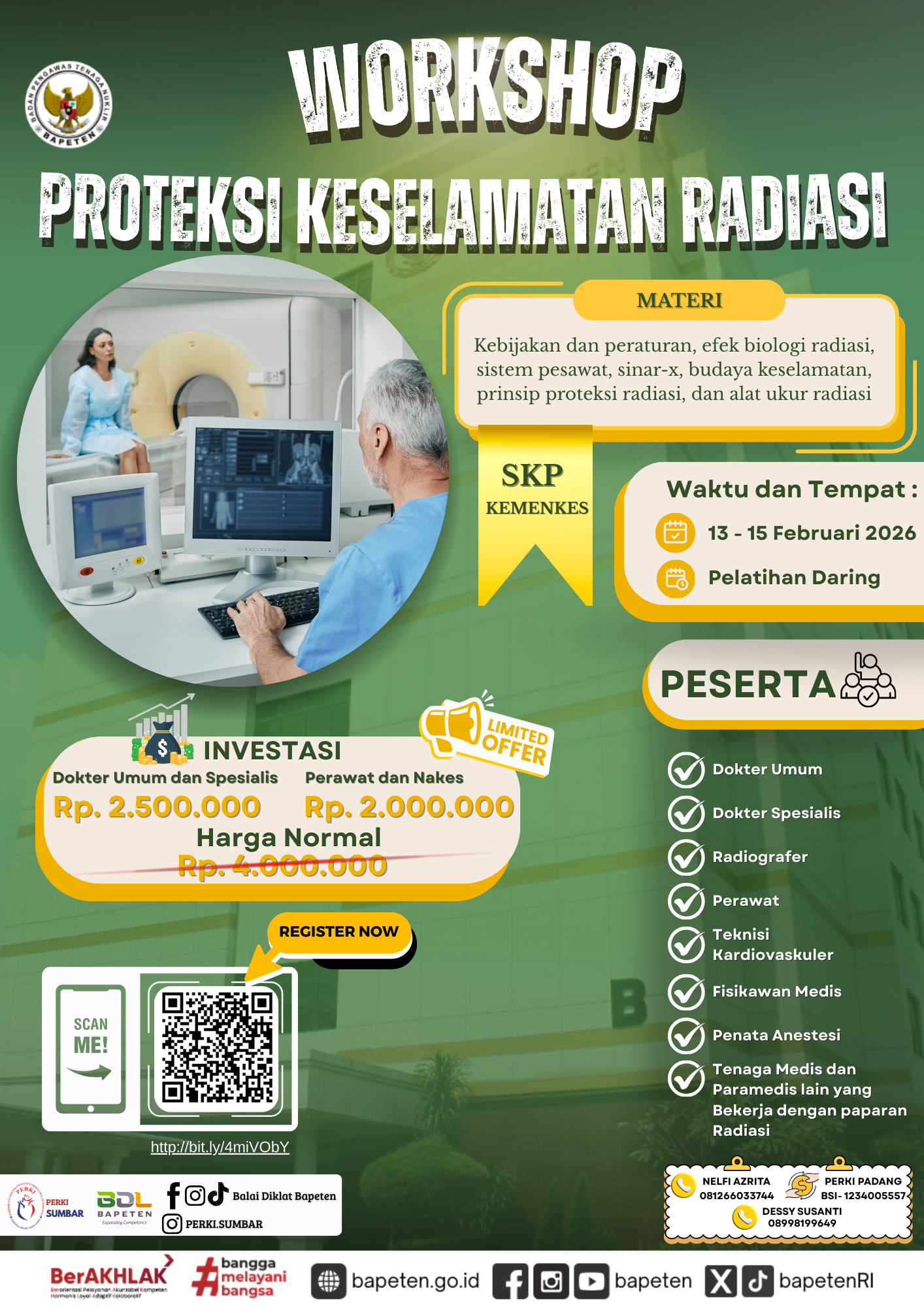 Kembali 03 Februari 2026 | Info BAPETEN | 42 lihatBAPETEN bekerja sama dengan PERKI Cabang Sumatra Barat untuk menyelenggarakan Workshop Proteksi dan Keselamatan Radiasi (PKR). Adapun jadwal kegiatan akan dilaksanakan pada 13-15 Februari 2026 secara daring. Informasi selengkapnya dapat dilihat pada poster di bawah ini.
