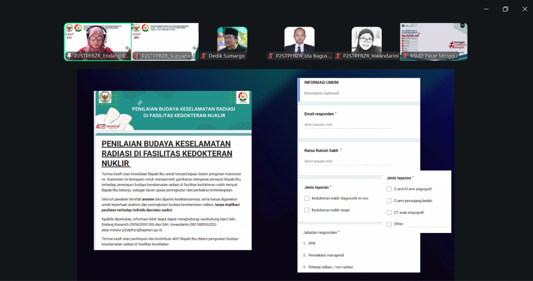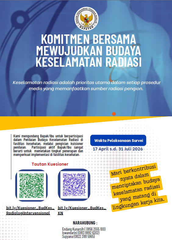 Kembali 17 April 2026 | Berita BAPETEN | 71 lihatBAPETEN melalui Pusat Pengkajian Sistem dan Teknologi Pengawasan Fasilitas Radiasi dan Zat Radioaktif (P2STPFRZR) menyelenggarakan diseminasi daring mengenai Penilaian Penerapan Budaya Keselamatan di Fasilitas Kesehatan pada 17 April 2026. Kegiatan ini merupakan langkah awal krusial sebelum dimulainya survei nasional bagi fasilitas kesehatan di seluruh Indonesia.